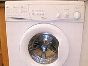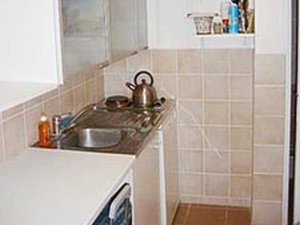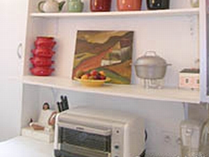 The eat-in kitchen, separated from the living room by a door, large mirror and partially glass wall, is equipped with a fridge, stainless-steel sink, custom-made wall shelves, microwave, oven and an electric and/or gas burner. Basic utensils, pots & pans are stored in cupboards.