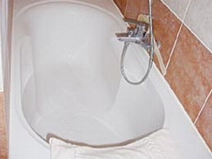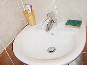 The bathroom contains a bathtub with a wall-mounted showerhead, a washbasin and a mirrored medicine cabinet.